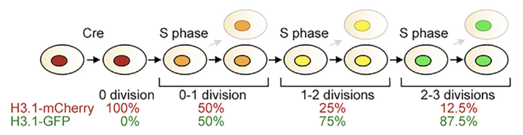 The inducible cell division counter (iCOUNT) method relies on recombination-induced tag exchange (RITE) of endogenously tagged long-lived proteins to fluorescent proteins to track the number of cell divisions (Denoth-Lippuner et al., 2021). In this case, histone variant H3.1 is tagged with mCherry and switches to EGFP upon Cre activation. Then, every subsequent cell division reduces the amount of H3.1-mCherry by half, as new H3.1-EGFP is produced to refill the pool of histones. By comparing the ratio of intensity between mCherry and EGFP, I can infer the number of cell cycles since Cre activation. This approach allows us to accurately count the number of cell divisions through integrated signal normalization. As this is a Cre-based system, genetic-based labeling is also possible. The authors claim that this method can count up to 3-4 cell divisions in vivo. iCOUNT mice are now commercially available, and our collaborator, Dr. Dwight Bergles, already has them expanding in his colonies.